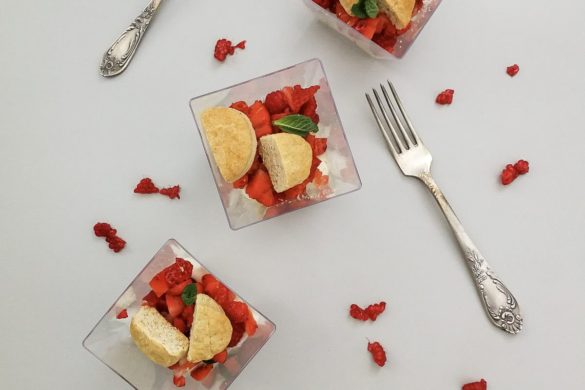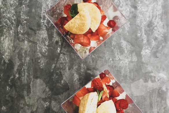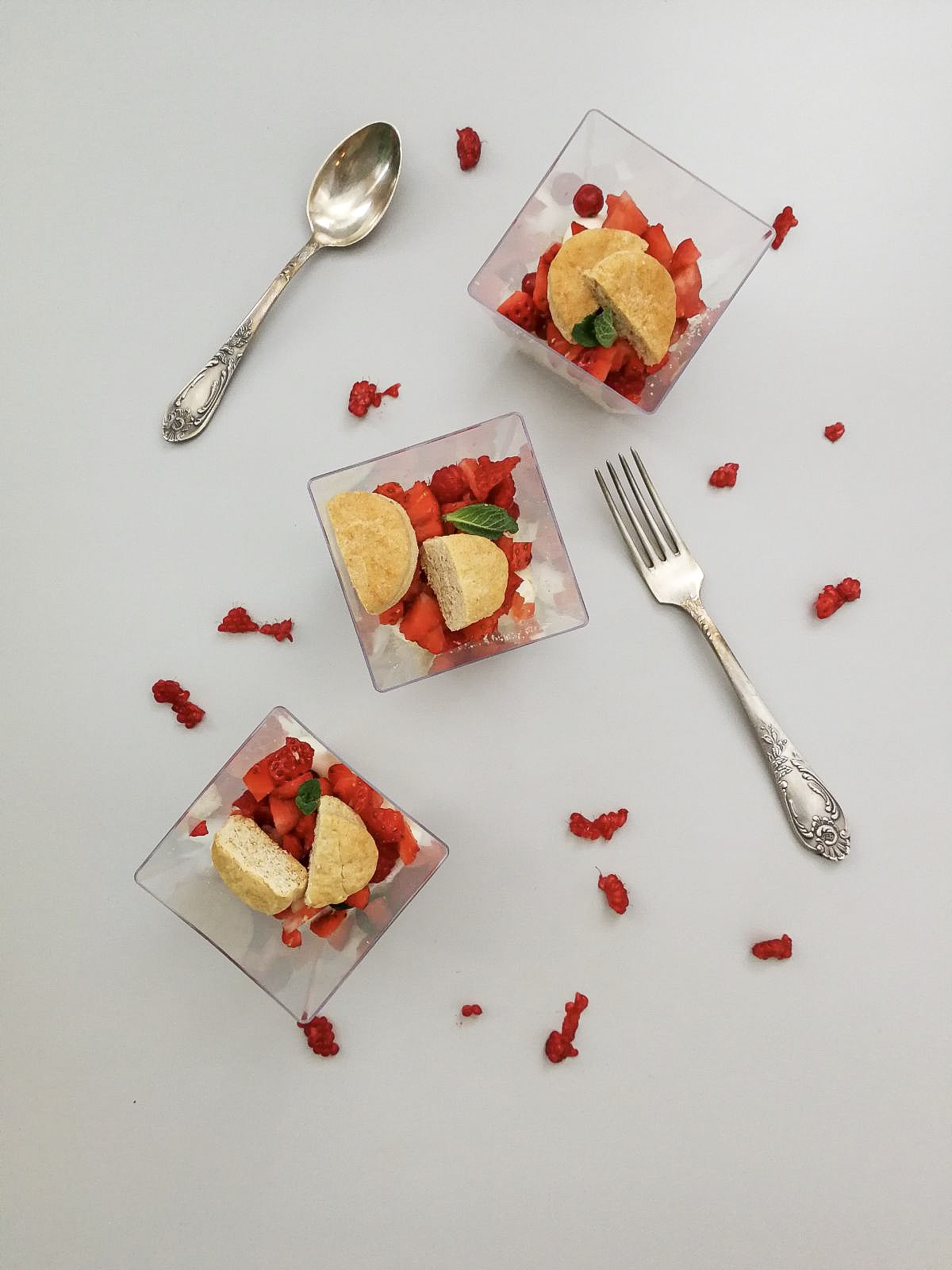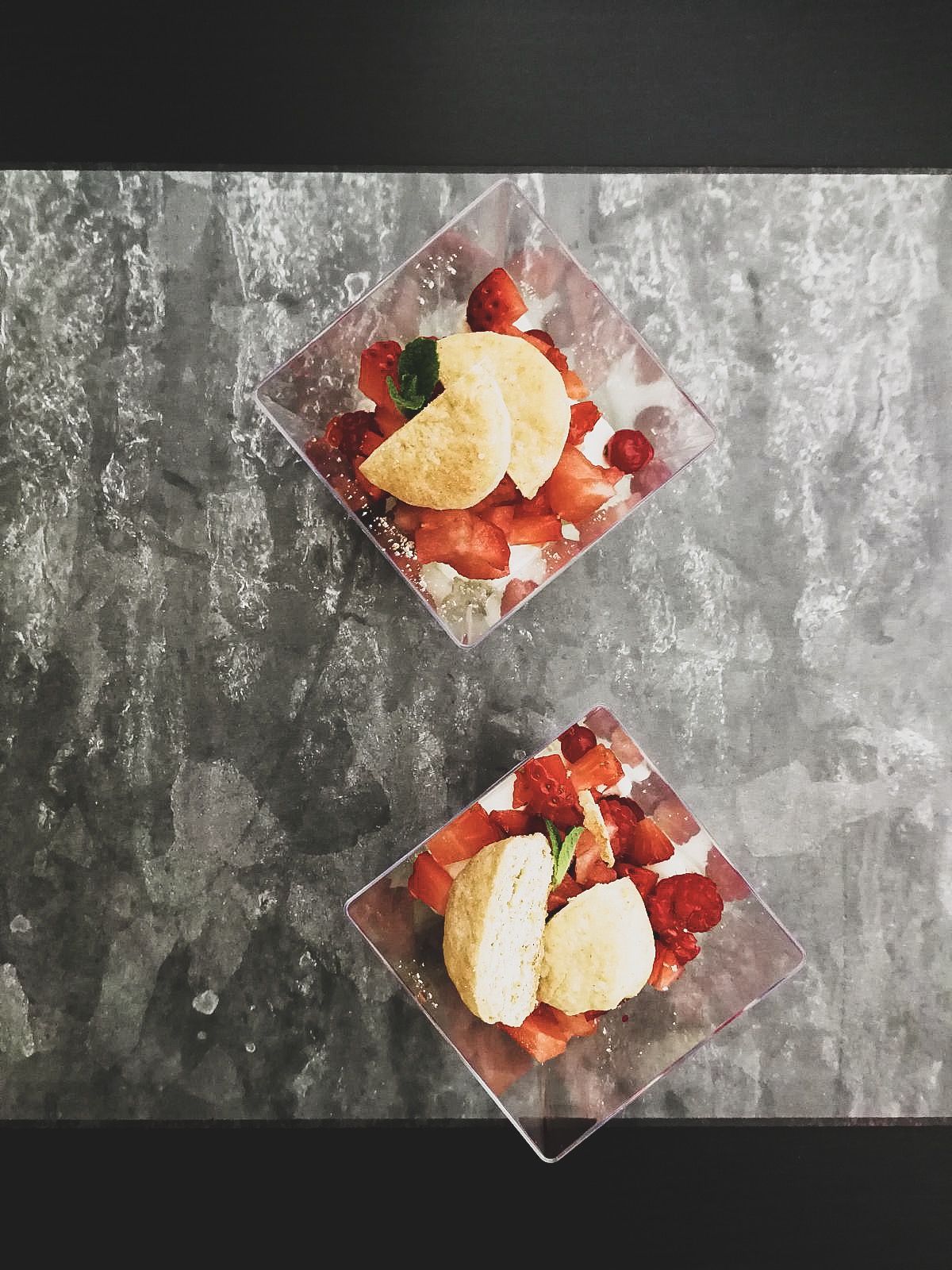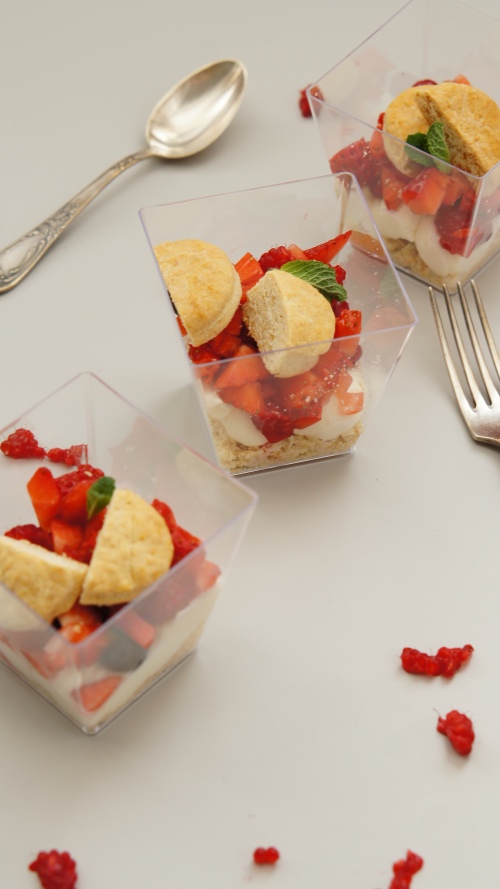 Mascarpone, sirop de agave, biscuiti (faina, unt, praf de copt, ou), fructe de padure si menta.