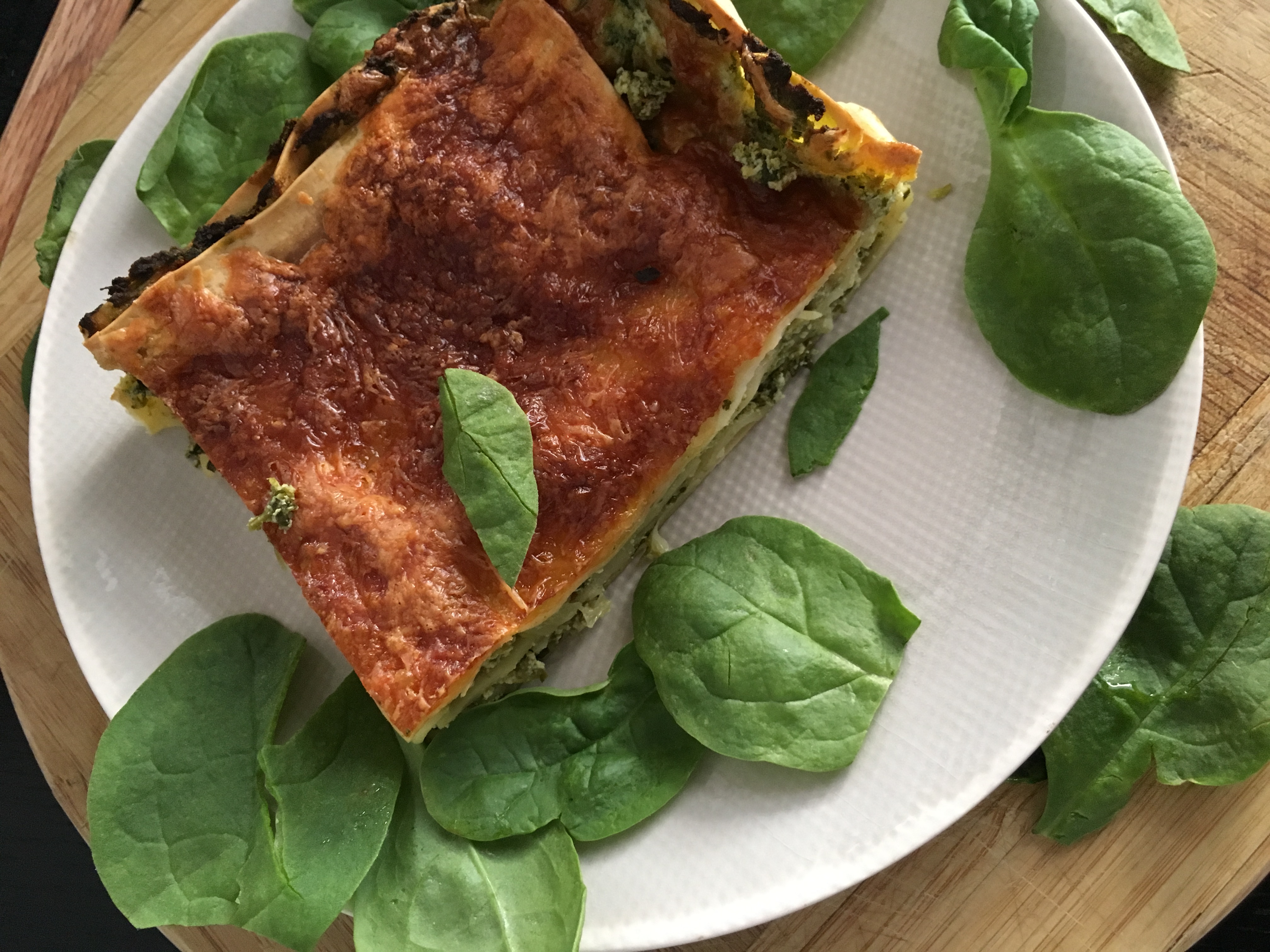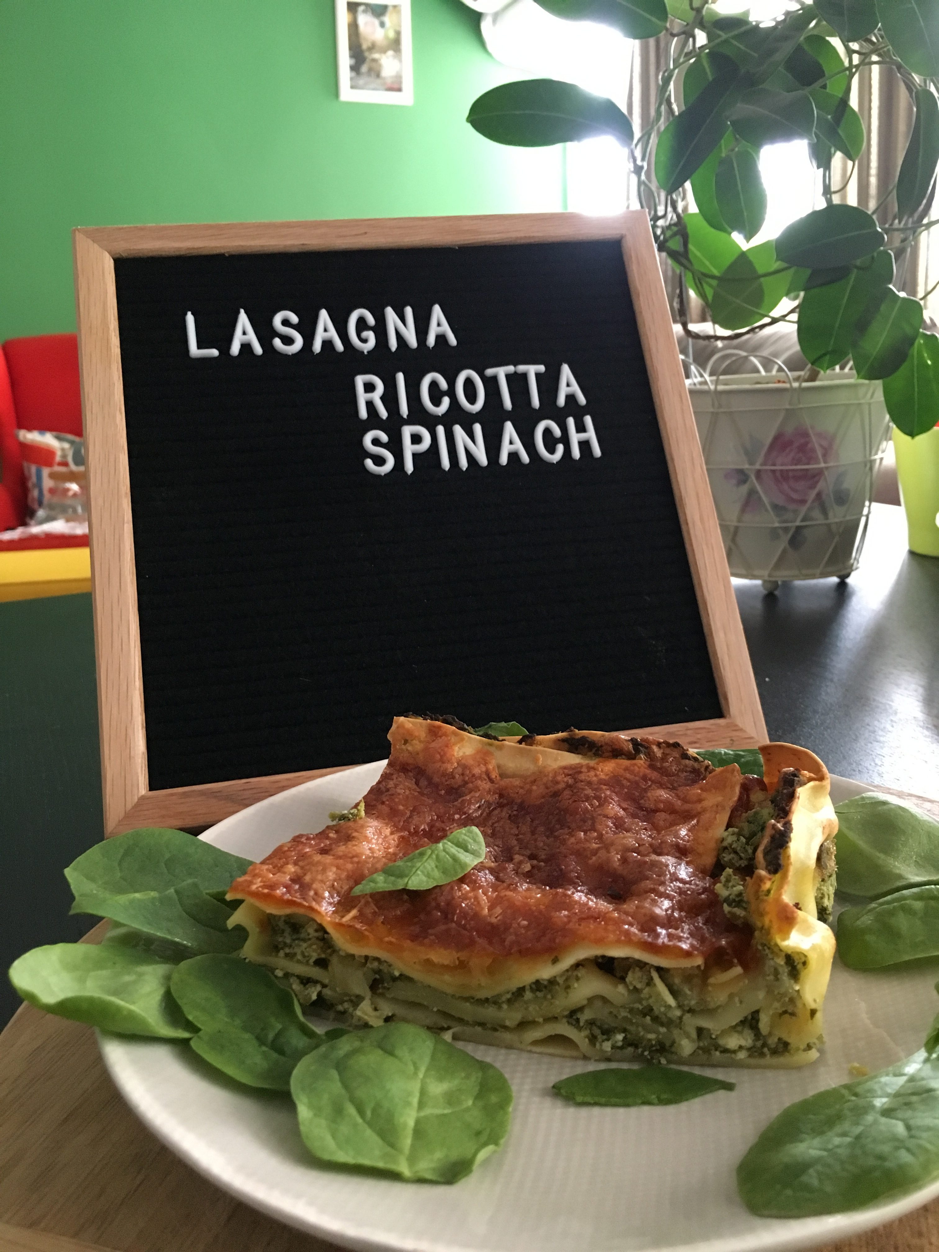 Intr-o tava (nu foarte mare) tapetata cu unt am pus un strat de foi, peste care am adaugat o parte din sosul de rosii si o parte din spanac. Am pus din nou un strat de foi de lasagna, sosul de rosii si spanac.. A urmat un ultim start de foi, peste care am pus din nou sos de rosii. Am adaugat mozzarella rasa si putin parmezan.