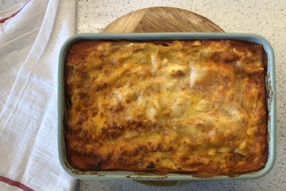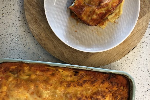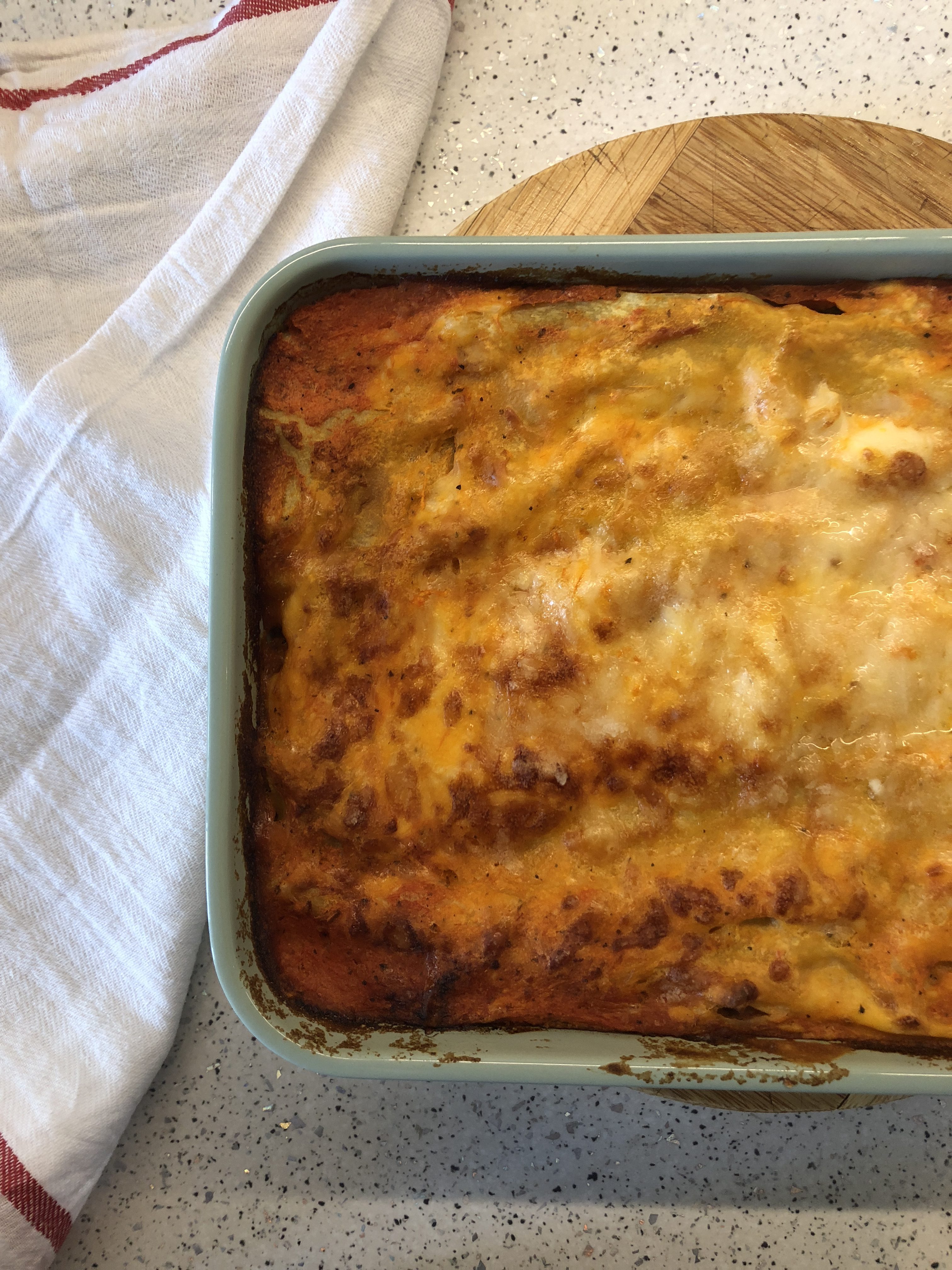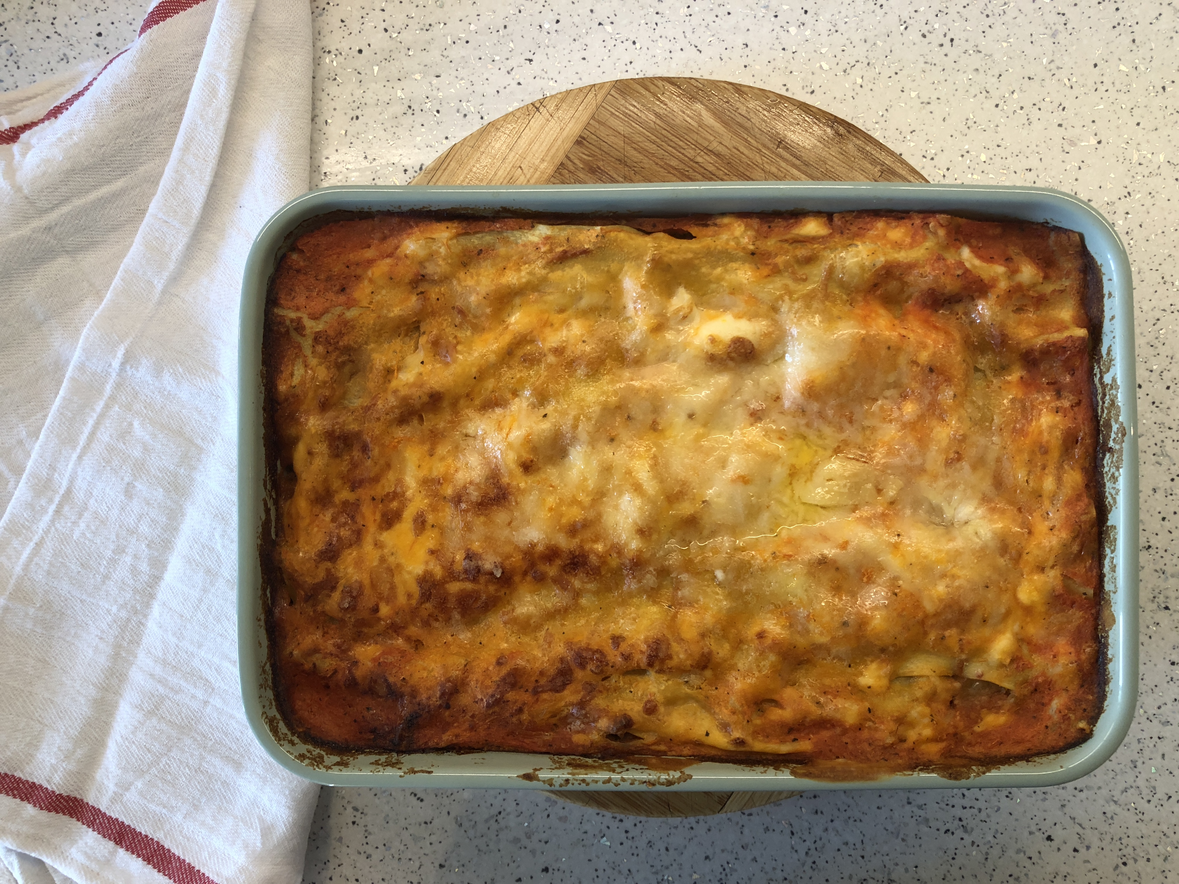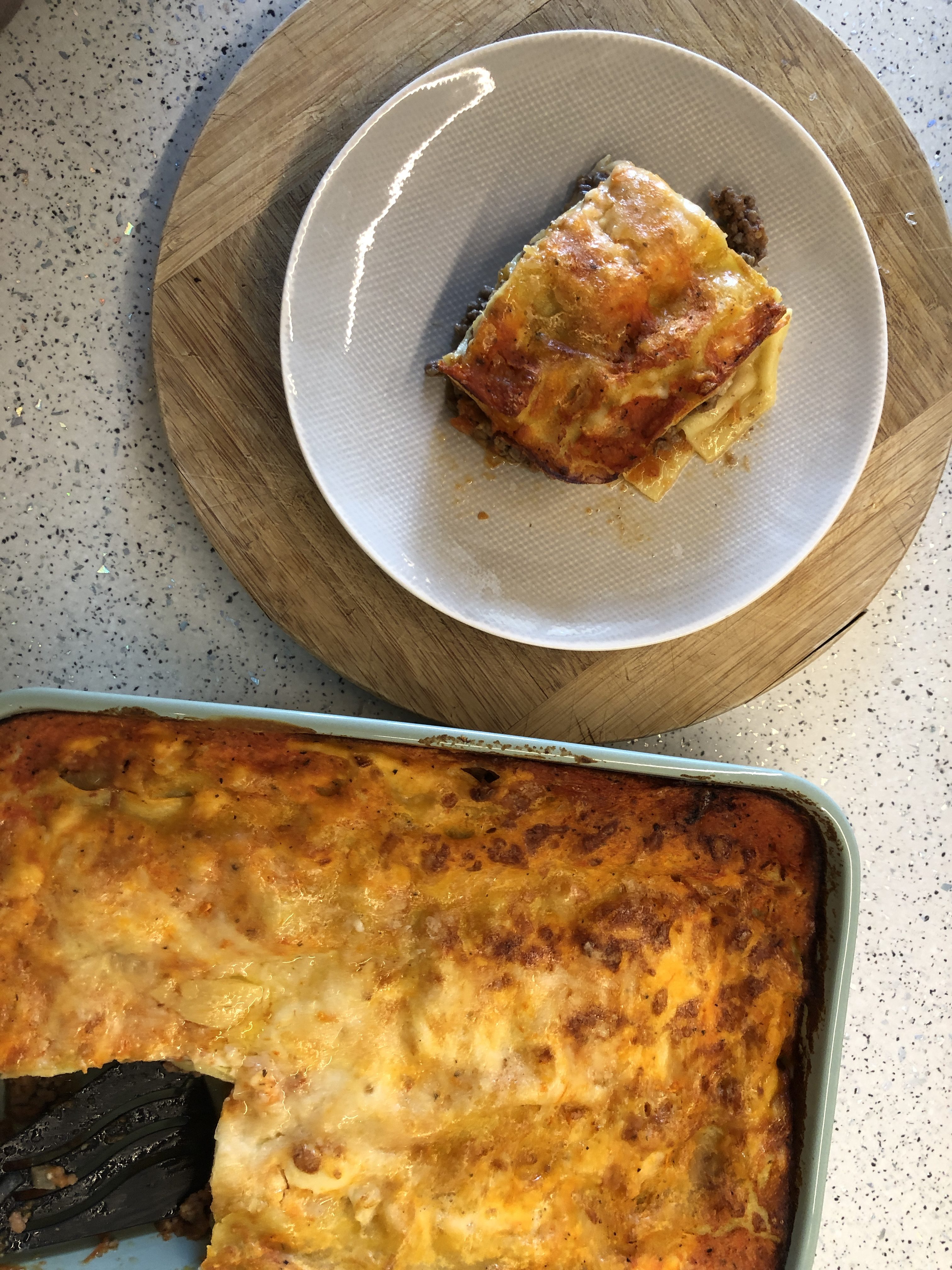 Intr-o tava (nu foarte mare) tapetata cu unt am pus un strat de foi, peste care am adaugat o parte din sosul de rosii si o parte din carne. Am pus din nou un strat de foi de lasagna, sosul de rosii, carnea si o parte din sosul bechamel. A urmat un ultim start de foi, peste care am pus din nou sos de rosii si sos bechamel. Am adaugat mozzarella rasa si putin parmezan.