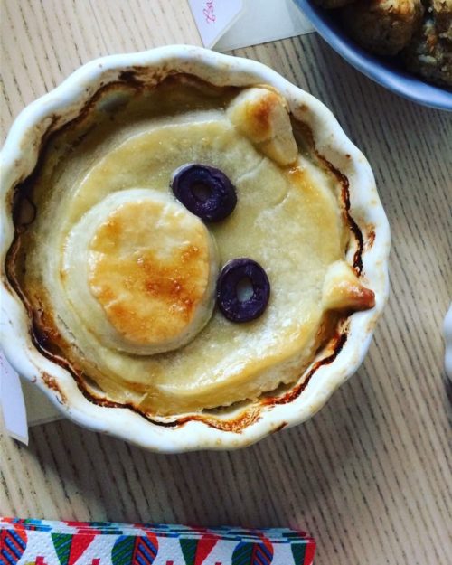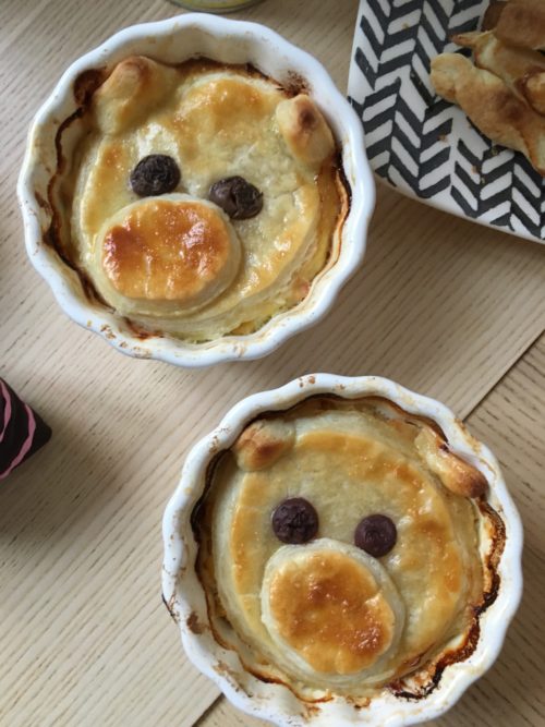Da, am urmat reteta in proportie de 95%. Ce am modificat: am pus mai putin pui, nu am pus sare iar aluatul de foietaj, folosit pentru fata porcusorilor, este facut in casa, fara sare.